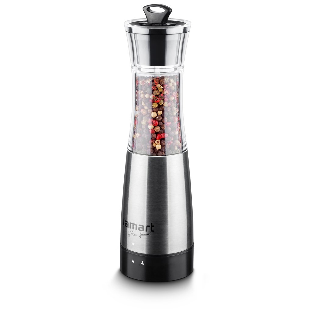 Mlynček na korenie/korenie/soľ gravitačné GRAVITY. Mlynček na korenie/korenie/soľ je vyrobený z nehrdzavejúcej ocele a plastu s keramickým mlecím mechanizmom s nastaviteľnou hrubosťou mletia. Priehľadná doplňovacia komora umožňuje sledovať naplnenosť mlynčeka. vládanie mlynčeka jednou rukou po otočení o 180 , motorček mlynčeka na 6x AAA batérií ( nie sú súčasťou). Súčasťou mlynčeka viečko na zachytenie zvyškov korenia.