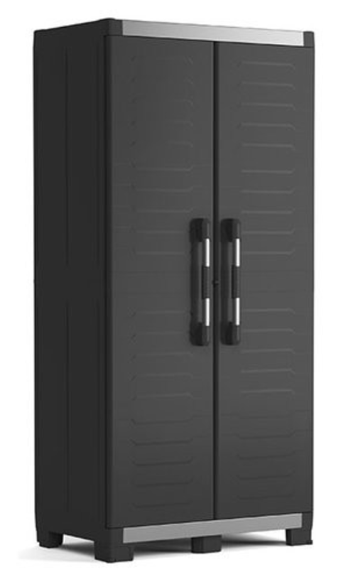 …sa vyznačuje robustným dizajnom s matne čiernymi dvierkami, ktoré sú zvýraznené horizontálnym plastickým vzorom a doplnené kovovo striebornými detailmi. Elegantné línie a kontrastné lemovanie v hornej a spodnej časti podčiarkujú jej profesionálny a technický vzhľad. Skriňa je vybavená výraznými madlami s kovovými prvkami, ktoré nielen uľahčujú manipuláciu, ale zároveň dodávajú celej konštrukcii štýlový charakter. Séria stojí na pevných nožičkách, ktoré zaisťujú stabilitu a prúdenie vzduchu od podlahy. Dvierka sú zavesené na kvalitných pántoch, ktoré umožňujú hladké otváranie. Vnútorný priestor je osadený výškovo nastaviteľnými policami s nosnosťou 20 kg. V ponuke má táto séria skrine vysoké a nízke.