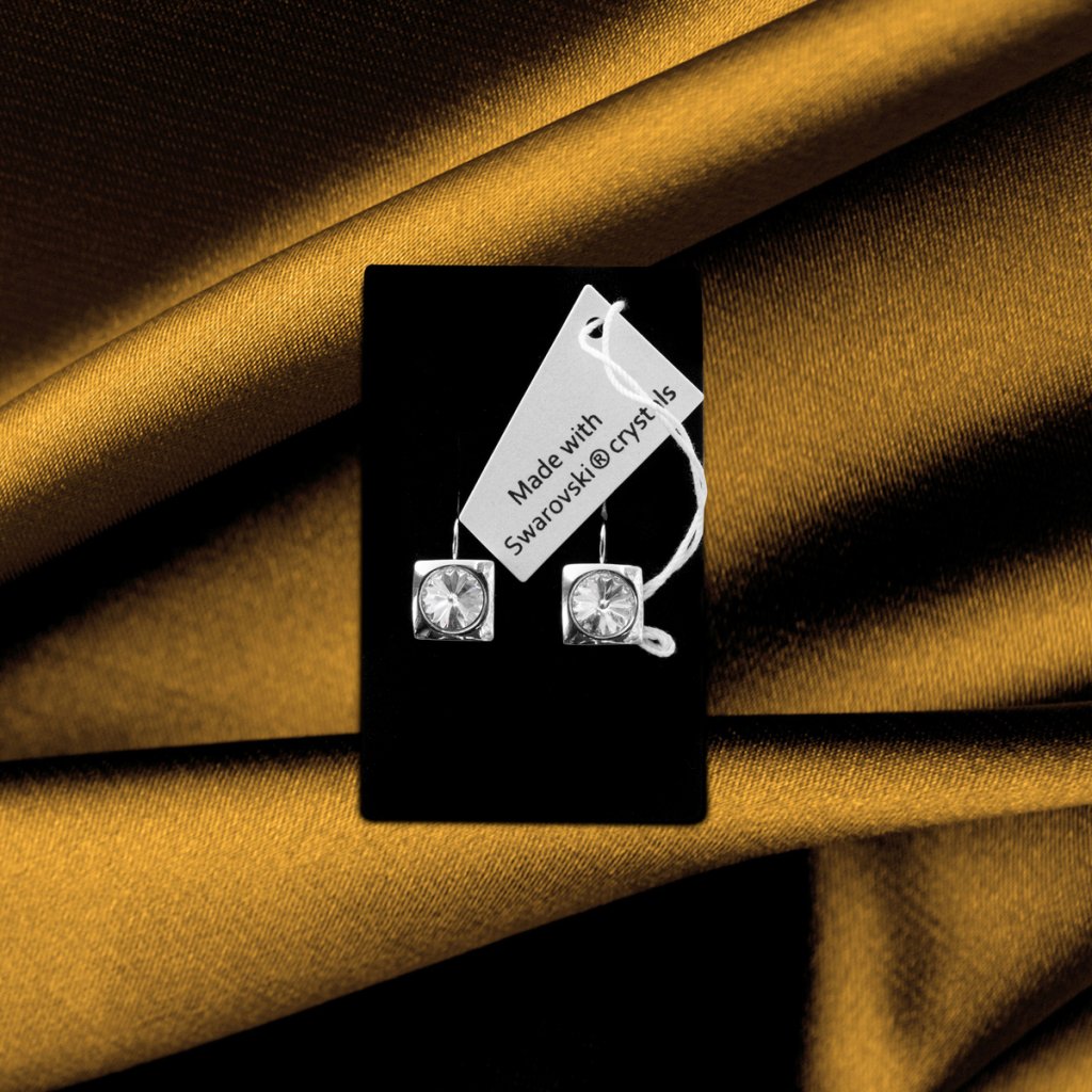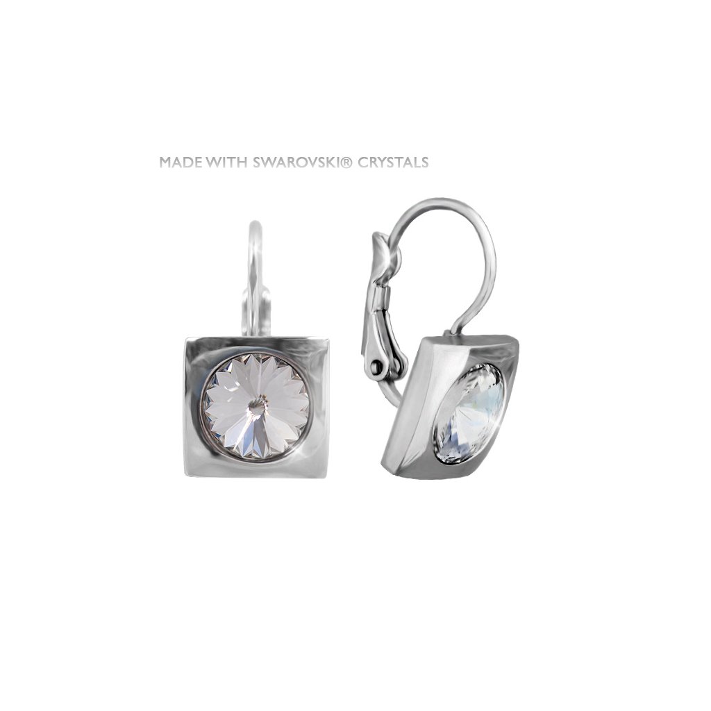 Náušnice sú zdobené kryštálmi spoločnosti Swarovski rivoli 8mm. Rozmer náušníc 2x1 cm. Prívesky náušníc sú vyrobené z rhodiovaného ušžachtilého kovu. Dodávané na klapke.