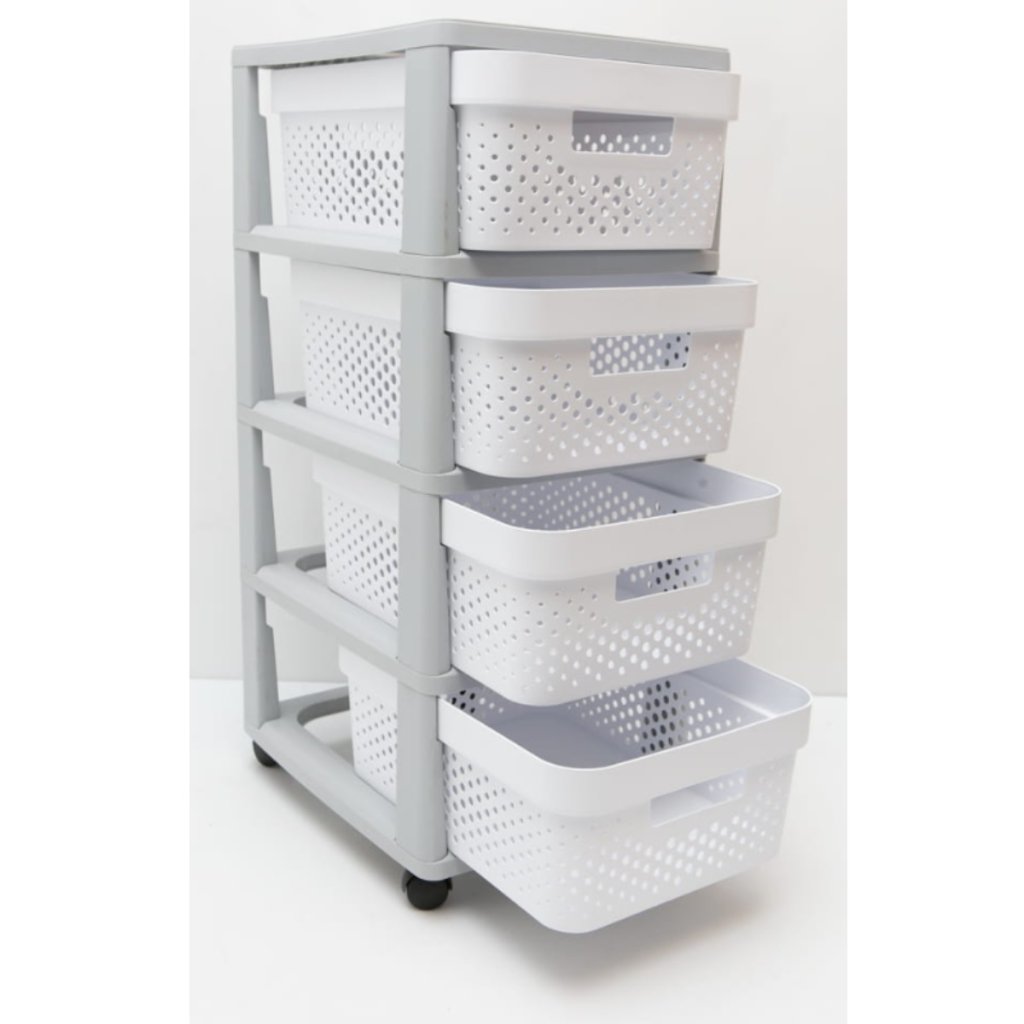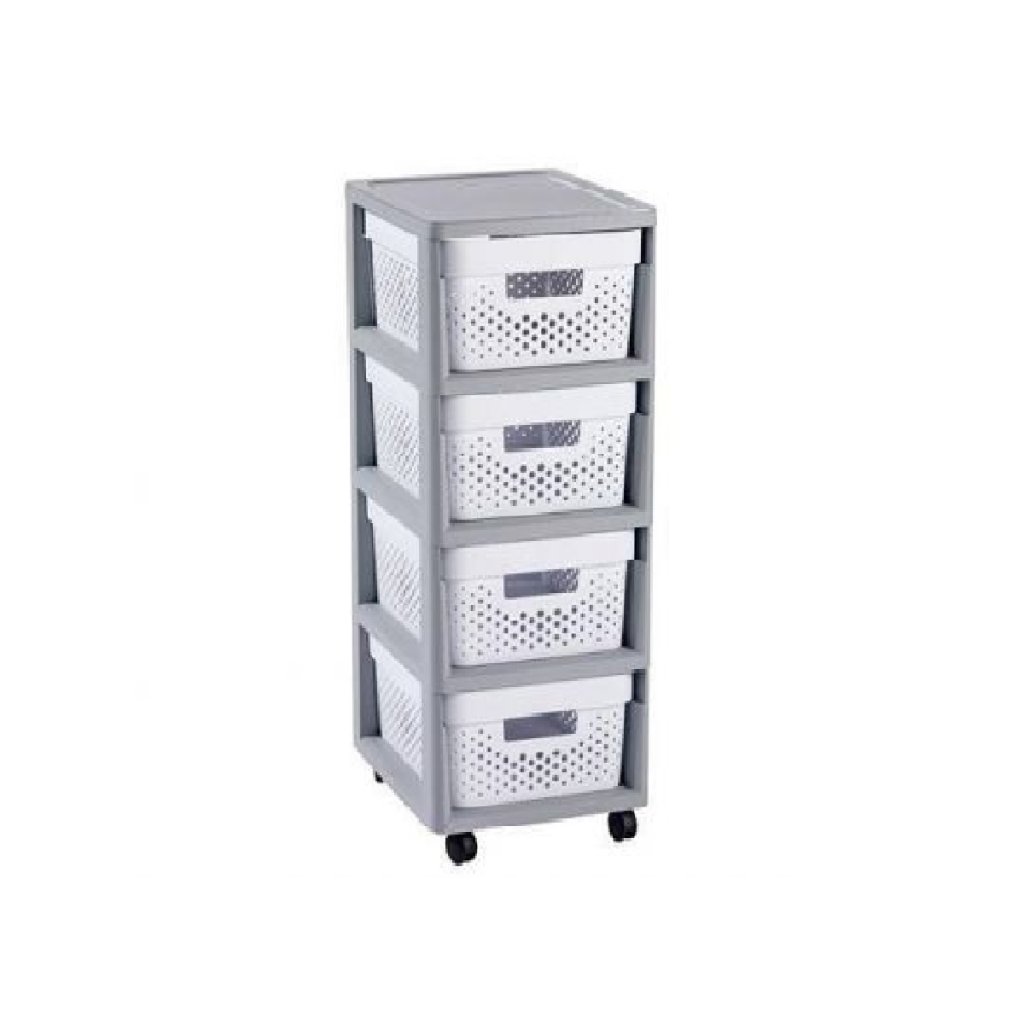 Jednoduchý spôsob usporiadania domácich potrieb - či konečne všetky drobnosti nájdu svoje stále miesto! Policový diel je vybavený štyrmi objemnými zásuvkami s pohodlnými úchytkami. Vďaka jednoduchému škandinávskemu štýle sa policový diel uplatnia v kúpežni, spálni, obývačke alebo v šatni. Pohodlné používanie tiež zaisťujú kolieska, umožňujúce premiestňovanie ponuku, a žahko sa udržujúci hladká povrchová úprava. Vežkosť 30x36x66cm.