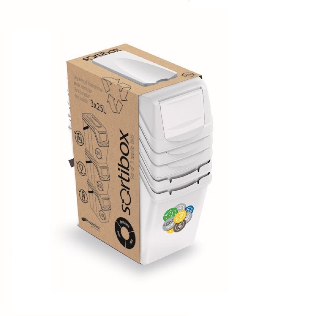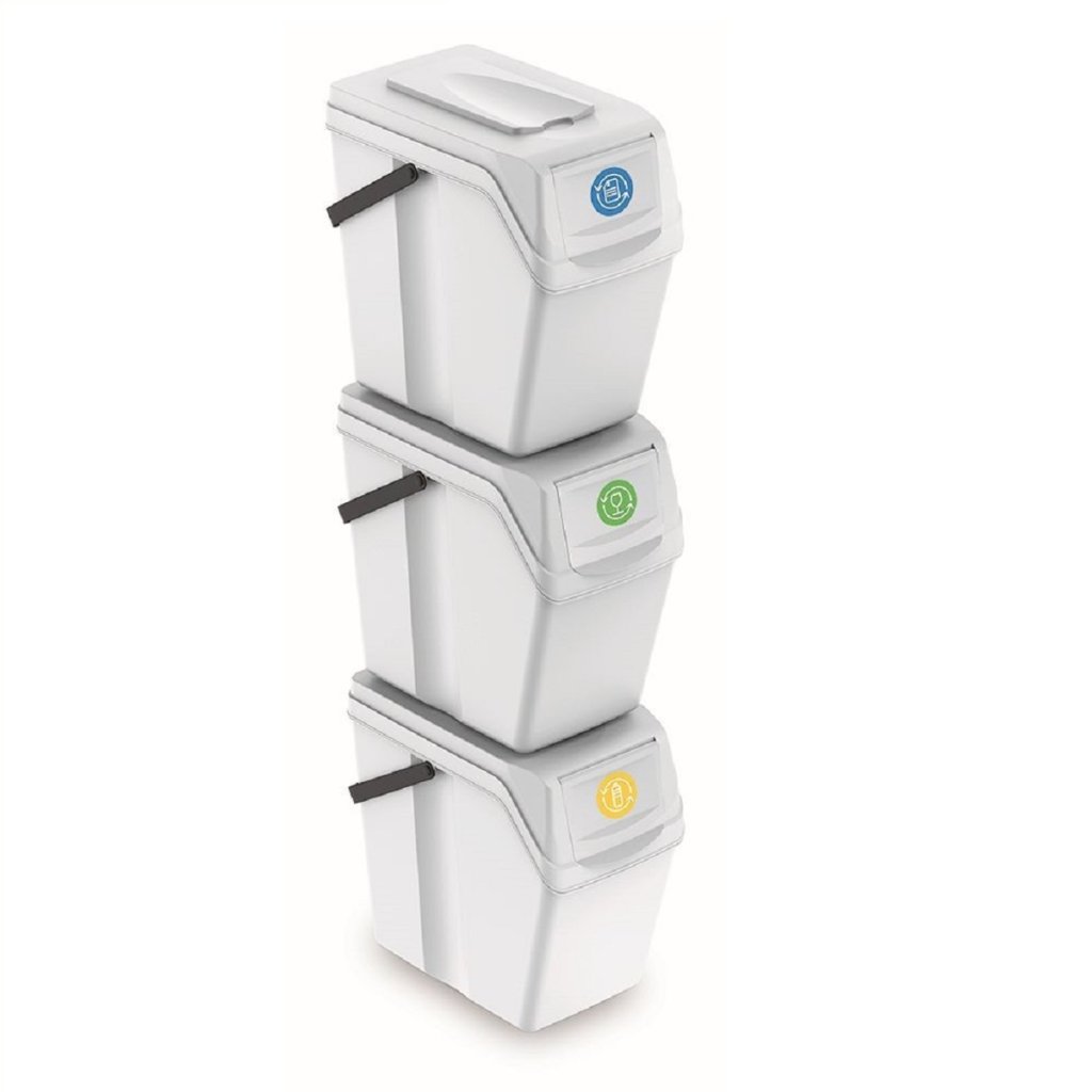 Koše majú odklápací chlopne a pohodlné rukoväte. Sada obsahuje samolepky s označením odpadu. Nádoby možno použiť na oddelenie, napríklad: papier, sklo, plast.