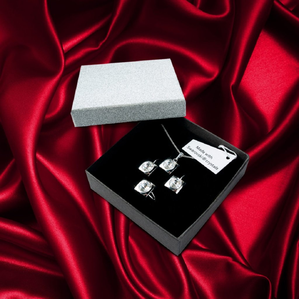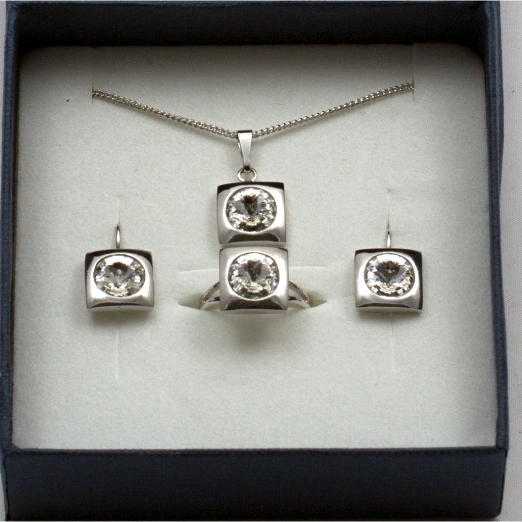 Luxusná rhodiovaná súprava tvorená náhrdelníkom, náušnicami a prsteňom, ktoré sú zdobené kryštálmi Made with Swarovski kryštály Rivoli o priemere 8 mm.