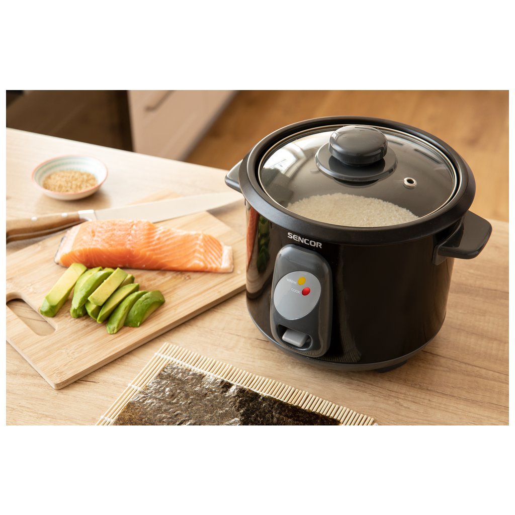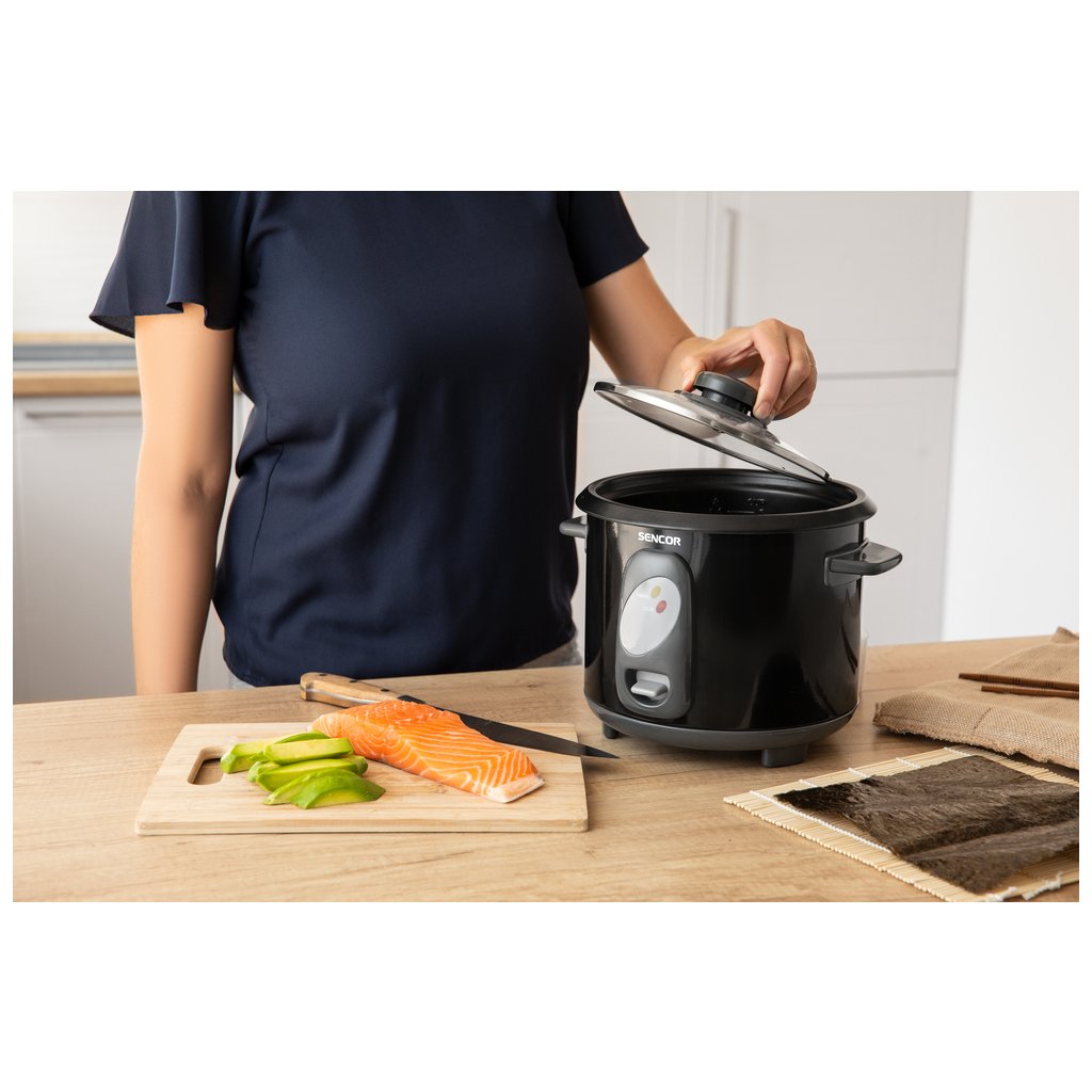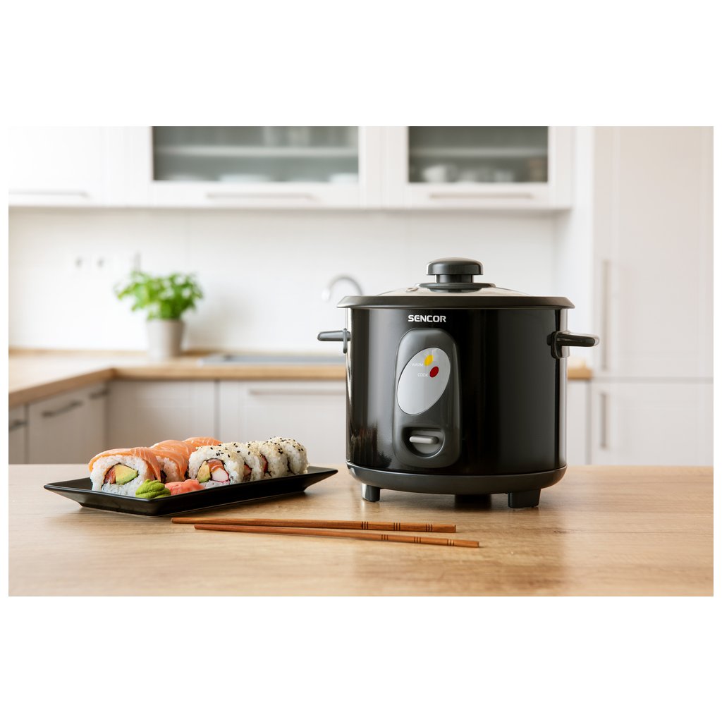 Špeciálny hrniec na varenie ryže Pracuje na princípe varenia v pare Vonkajší plášť z nerezu bjem 1 l (na prípravu 800 g ryže) Plne automatická prevádzka Vhodný na prípravu všetkých druhov ryže vrátane ryže na Sushi Automatické vypnutie po dovarení a prepnutí na funkciu Keep Warm (uchová ryžu teplú až 6 hodín) Sklenená pokrievka s otvorom na únik prebytočnej pary Praktické rukoväte po oboch stranách Jednoduché čistenie (vynímateľná vnútorná nádoba s nepriľnavým povrchom) Svetelné kontrolky prevádzky a udržiavanie teploty Protišmykové nôžky Trojnásobné bezpečnostné istenie: - ochrana proti prehriatiu - ochrana proti vyvareniu vody - automatické vypnutie po dovarení Dodávané príslušenstvo: špeciálna špachtľa na ryžu, odmerka na ryžu a vodu Príkon 400 W // SRM 1000SS Rozmery (šírka x hĺbka x výška): 270 x 230 x 225 mm Hmotnosť: 1.7 kg Napätie a kmitočet: 220-240 V, 50/60 Hz