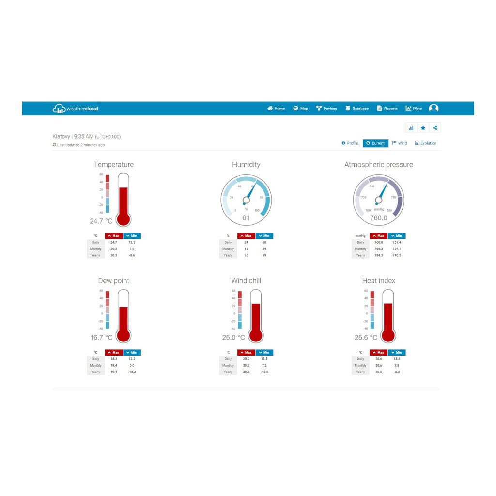 Podpora globálnych verejných meteorologických platforiem „Weather Underground a „Weathercloud Podpora českého verejného portálu „Počasie Meteo“ Publikovanie údajov o miestnej meteorologickej stanici na verejných meteorologických platformách Podpora chytrých zariadení, online prístup k dátam a histórii